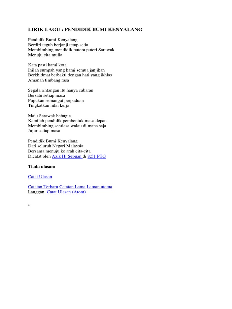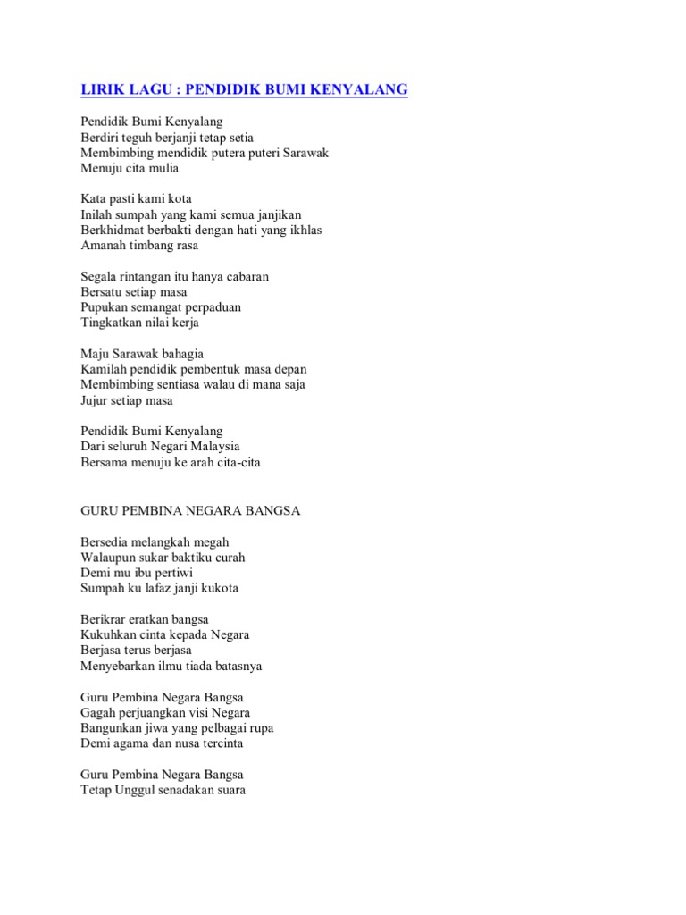 Aku kongsikan juga lagu Pendidik Bumi Kenyalang Harap pembaca boleh mainkan lagu ini sambil membaca kisah aku. Lagu Biarku Menjadi Lilin. DOWNLOAD Lagu Kami Guru Malaysia vokal DOWNLOAD Lagu Kami Guru Malaysia minus one DOWNLOAD Pendidik Bumi Kenyalang.